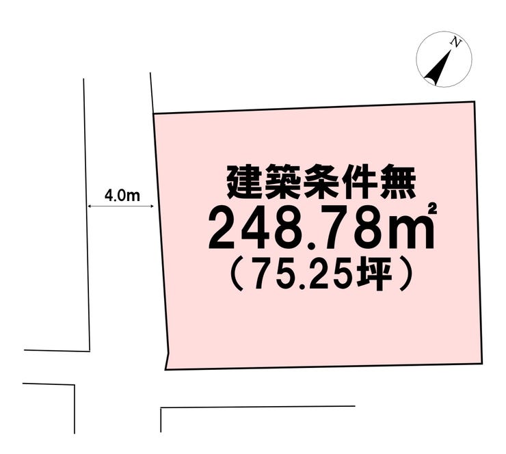 | 土地面積 | 公248.78㎡(75.25坪) | 接道 | 南西側(公道)幅 約4.0m 間口 約13.35m 南東側(私道)幅 約1.7m 間口 約17.50m |